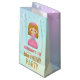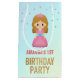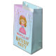 Niedliche Geburtstag Party Geschenktasche mit einer hübschen kleinen Prinzessin mit moderner Typografie auf einem pastellfarbenen Regenbogenuntergrund.