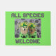 Diese Fußmatte kennzeichnet die goldenen Retriever, die als Außerirdische gekleidet werden. Die Mitteilung liest, "alles Spezies-Willkommen".