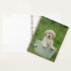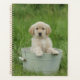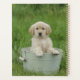 Purebred golden holen Welpen ab, die im Freien in einer Vintagen, cremefarbenen Waschwanne baden, die mit ihren Pfoten am Rand im Gras sitzt. Sie ist ein bezaubernder, flauschiger, blondenfarbener Babyhund mit braunen Augen und schwarzer Nase.