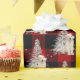 Niedlicher, goldener Retriever Welpe mit Weihnachtsmannmütze und weißem Urlaubsholm in Schneeflocken auf rot und schwarz Büffel kariert.