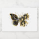 Goldener Schmetterling mit schwarzem Schmuckorchid, mit goldenen Blätter auf weißem Hintergrund dekoriert.