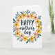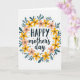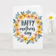 Diese Muttertags-Karte zeigt einen kreisförmigen Kranz aus stilisierten Blumen und Blättern auf weißem Hintergrund, der die Nachricht in einer sanften, liebevollen Umarmung umschließt ❤️. Das Wort „HAPPY“ sitzt oben in einer dunklen, dicken Schriftart, während „mother’s day“ direkt darunter in einer fließenden, kursiveartigen Schrift erscheint, um einen weicheren, zarteren Kontrast zu schaffen. Der Kranz mischt sonnengelbe Blüten mit rosafarbenen Blumen und suggeriert die Art von warmer Nähe, die man bei einer langen Umarmung oder einem süßen, verständnisvollen Blick teilt 🌼. Teal-farbene, längliche Blätter winden sich zwischen den Blüten und geben dem Ring einen ruhigen, stetigen Rhythmus, der wie unterstützende Begleitung wirkt. Kleine schwarze Punkte sind um die Anordnung herum verstreut wie Konfetti und fügen eine leichte, freundliche Energie hinzu, ohne das Zentrum zu überfüllen. Winzige goldene, sternförmige Markierungen glänzen zwischen Blütenblättern und Blät