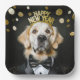 Ein goldener Retrivalhund, der in einem formalen schwarzen Smoking und Bugs-Krawatte gekleidet ist, trägt ein festliches "Happy New Year"-Headband.