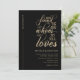 Feiern Sie Ihren großen Tag stilvoll mit unserem "Modern Gold Script on Black Bible Verse Christlich Wedding Invitation". Diese Einladung verbindet ein elegantes und modernes Design mit Christlichen Themen und schafft so eine personalisierte Einladung. Mit minimalistischer Typografie und klaren Linien ist diese Einladung ideal für Paare, die einen zeitgenössischen Stil schätzen. Das Gold auf schwarzen, fetten Farben-Schema bietet einen subtilen und dennoch raffinierten Rahmen für Ihre Hochzeitsdetails. Das Christlich inspirierende Bible Verse Song von Solomon 3:4, "Ich habe den gefunden, den mein Soul Lieben." fügt der Einladung eine sinnvolle Touch hinzu. Diese Einladung spiegelt wunderbar die Werte und Überzeugungen wider, die Ihnen und Ihrem Partner wichtig sind. Unser hochwertiges Papier- und Druckwerk sorgt dafür, dass Ihre Einladung so schön aussieht wie in den Bildern. Und mit viel Platz für Ihren personalisierten Text, können Sie einfach die Einladung mit Ihrer eigenen, einzigartigen Formulierung anpassen.