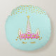 Goldenes Einhorn, Blume & Goldene Confetti auf Aqu Rundes Kissen