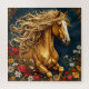 Ein zauberhaftes Bild eines goldenen Pferdes mit fließender Mähne, die von pastellfarbenen Blume geschmückt ist und Schönheit und Eleganz hervorruft. Zeigt Details und Charme, ansprechend für Natur- und Pferdefreunde.