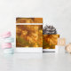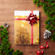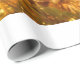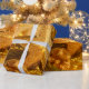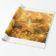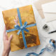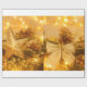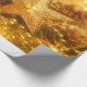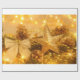 Elegantes Weihnachtsgeschenkpapier mit schönen goldenen Ornamenten (Stern, Bogen, Perlen), Kiefernzapfen und glitzernden Weihnachtslichtern.