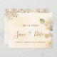 Eine trendige und mädchenhafte Save the Date-Karte für eine 40. Geburtstagsfeier (oder jedes Alter). Ein goldfarbener Hintergrund mit goldenem Eukalyptusblättern und Imitaten goldener Glitzer Staub. Personalisieren und fügen Sie Datum, Namen und Text. Goldene Buchstaben. Der Text: Save the Date ist mit einem großen angesagten, handgeschriebenen Stilskript geschrieben.