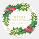 Elegantes Gold & Rot "Frohe Weihnachten" Weihnachtsaufkleber mit Watercolor Holly, Glitzer Confetti & glänzenden Rahmen.