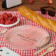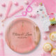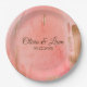 Hübsches Gold, rosa, pfirsichfarbene Teller mit Namen und Datum. Brauner Schriftart. Ideal auch für Brautparty.