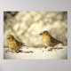Dieses Poster zeigt einen Pine Siskin, der mit einem männlichen Goldschmuck spricht, obwohl er einen Sonnenblumensamen im Mund hat! Sie sind an einem sonnigen Wintertag, der von einem goldenen Licht erhellt wird, im Schnee stehend.