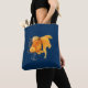 Nautischer Totbeutel mit fantasievollen Goldfischen, Ruder und Ankerillustrierung auf marineblau Hintergrund.