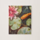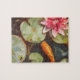 Goldfish in einem Pong mit Water Lilies Dieser Goldfisch oder Koi Schwimmen in einem Seerosenteich ist ein klassischer Blick auf ein universell schönes Thema. Das Bild wird von der florida Künstlerin Mary Hubley gemacht. Zwei Goldfische schwimmen unter mehreren Lilienkissen. Auf der Seite befindet sich auch eine große rosa Lilie, die in voller Blüte steht. Eine schöne Ergänzung zu jedem Dekor der Zuhause, ein Lilienteich mit rosa Seerosen, ist etwas, das die klassischen Impressionisten geschaffen haben, besonders Claude Monet, als er in Frankreich viele Lilienteiche-Bilder kreierte. Der Lilienteich, die rosa Seerosen und der Koi sind wunderschöne Orte. Friedliche Koi, wunderschöne Lilienpads und ruhige Lilienlilie-Blume sind perfekt!