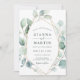 Diese Hochzeitseinladung enthält gemalte Aquarelltöne und botanisch grüne Blätter mit goldenem geometrischem Rahmen.