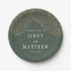Papierplatte der modernen und eleganten Hochzeit, die vergoldetes Hand gezeichnetes tropisches Grün des Bananen-Blätter kennzeichnet. Die Linien der Palmblätter sind im ImitatgoldGlitter. Der Hintergrund ist grün. Fertigen Sie dieses Produkt besonders an, indem Sie Ihre eigenen Hochzeitsinformationen addieren. Groß für Bestimmungsort- oder Strandhochzeit im Sommer.