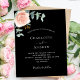 Schwarzer Hintergrund. Dekoriert mit einer Rose Gold und rot rosa Blumen, Rose Blume und grüne Aquarell Eukalyptus Blätter, Sprigs, Grün und Imitate Gold sprigs. Personalisieren und fügen Sie Ihre Namen und Hochzeitsdetails. 1 Blatt = 1 Einladung mit Druckkante bis Kante.