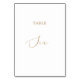 Dieser zarte Goldkalligraphietisch mit sechs Tischnummern ist perfekt für eine moderne Hochzeit. Das romantische minimalistische Design besticht durch eine hübsche und elegante Champagner-goldgelbe Typografie auf weißem Hintergrund mit einem klaren und schlichten Look. Die Karte druckt auf der Vorder- und Rückseite (beidseitig). Andere Tischnummern in der Sammlung werden separat verkauft.