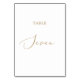 Dieser zarte Goldkalligraphietisch mit sieben Tischnummern ist perfekt für eine moderne Hochzeit. Das romantische minimalistische Design besticht durch eine hübsche und elegante Champagner-goldgelbe Typografie auf weißem Hintergrund mit einem klaren und schlichten Look. Die Karte druckt auf der Vorder- und Rückseite (beidseitig). Andere Tischnummern in der Sammlung werden separat verkauft.