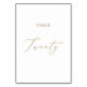 Dieser zarte Goldkalligraphietisch mit zwanzig Tischnummern eignet sich perfekt für eine moderne Hochzeit. Das romantische minimalistische Design besticht durch eine hübsche und elegante Champagner-goldgelbe Typografie auf weißem Hintergrund mit einem klaren und schlichten Look. Die Karte druckt auf der Vorder- und Rückseite (beidseitig). Andere Tischnummern in der Sammlung werden separat verkauft.