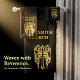 Das goldkatholische Kreuz mit Flügeln und ein Platz, um den Kirchennamen und den schwarzen Hintergrund zu setzen, kann auf jede Farbe geändert werden, die Sie gewollt haben.