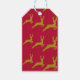 Ein Trio Goldhirsche Silhouetten springen über einen gemusterten Hintergrund in kräftigen Rot- und Goldtönen. Schöne, elegante und elegante Geschenketiketten!