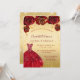 Eine moderne, stilvolle und glamouröse Einladung zu einer Quinceañera, 15. Geburtstagsfeier. Ein Imitat goldener Hintergrund mit Imitaten goldenen Glitzer Staub, ein Kleid und rote Rosen, Blumensträuße. Der Name ist mit einem modernen handgeschriebenen Stilskript geschrieben. Personalisieren Sie Ihre Party-Daten und fügen Sie sie hinzu.