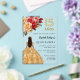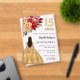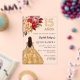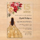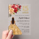 Eine moderne, stilvolle und glamouröse Einladung zu einer Quinceañera, 15. Geburtstagsfeier. Ein klarer, transparenter Hintergrund, ein Mädchen mit goldenem Kleid und roten, rosa und goldenen Rose, Blumen. Der Name ist mit einem modernen handgeschriebenen Stilskript geschrieben. Personalisieren Sie Ihre Party-Daten und fügen Sie sie hinzu.