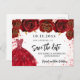 Eine gmädchenhafte und trendige Save the Date-Karte für eine Quinceañera, 15. Geburtstagsfeier. Schwarzer Hintergrund mit schwarzen Rose, vergoldeten Glitzer-Imitaten und goldenem Kleid. Personalisieren und fügen Sie Datum und Name/Alter hinzu. Der Text: Save the Date ist mit einem großen angesagten, handgeschriebenen Stilskript geschrieben.