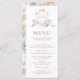 Elegantes Hochzeitsmenü mit einem Vintagen Wappen mit Monogramm. Dreh die Karte um ein schönes Blumenmuster mit Pfauenfedern zu zeigen.