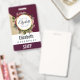 Abzeichen mit personalisiertem Namen mit goldgelbem Marmormotiv und einer roten Bordeaux-Farbe in diagonaler Form. Ein Kreis mit einem Imitat mit goldfarbener Folienabdeckung, der auf einem hübschen Blumenstrauß mit Rose, Nelken und anderen Blume verlegt ist. Personalisieren Sie mit Ihrem Namen und Monogramm im Kreis.