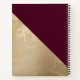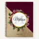 Ein Wendelheft mit goldgelbem Marmormuster und einer soliden bordeauxroten Farbe, die schräg zusammengeschichtet ist. Ein Kreis mit einem Imitat mit goldfarbener Folienabdeckung, der auf einem hübschen Blumenstrauß mit Rose, Nelken und anderen Blume verlegt ist. Personalisieren Sie mit Ihrem Namen und Monogramm im Kreis.