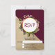 Eine RSVP Hochzeitskarte mit goldenem Marmormuster und solider bordeauxroter Farbe, die diagonal angeordnet ist. Ein Kreis mit einem Imitat mit Goldfolie überlagert einen hübschen Blumenstrauß mit Rose, Nelken und anderen Blume.
