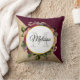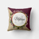 Ein Kissen mit goldenem Marmormuster und eine solide bordeauxfarbene, diagonal überlagerte Farbe. Ein Kreis mit einem Imitat mit Goldfolie überlagert einen hübschen Blumenstrauß mit Rose, Nelken und anderen Blume. Personalisieren Sie mit Ihrem Vor- oder Nachnamen und Monogramm im Kreis.