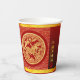 Ein elegantes visuelle einer goldenen Schlange mit Blüten zu einem Kreis (inspiriert durch traditionelle chinesische Papierschnitt) mit roten Kreuzen überlagert ein rotes und gelbes traditionelles asiatisches Muster + grafische "GLÜCKLICHES NEUES JAHR" in Chinesisch und Englisch und alte chinesische Kalligraphie für "Pferd" auf der rechten Seite auf gradiantem roten Band. Design auf Party Papier Becher. Passende Grußkarte, Ferienpostkarte, quadratische Flachkarte, runde Flachkarte, vertikale Flachkarte und mehr bald.