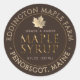 Bearbeiten Sie Ihren Firmennamen, Ihre Adresse, das Volumen des Ahornsirup und Ihre Note. Goldzuckerblatt mit Ahornsirup in metallischem Gold und einem einfachen Rahmen. Brauner Hintergrund.