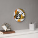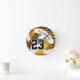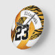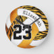 Diese wilde Zebrastreifen-Wanduhr eines Mädchens aus Volleyball weist ein gewagtes zebraaktes Muster auf vier Panels des Volleyballs auf - die Zebrastreifen-Paneele und drei weitere Panels haben einen orange/goldenen Hintergrund, der mit den restlichen weißen Volleyballplatten kontrastiert - mit Spielernamen und Jersey-Nummer abgestimmt - von katz_d_zynes