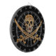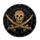 Gold farbiger Schädel und gekreuzte Schwerter. Für den diskriminierenden Piraten. Merken Sie bitte dieses ist ein Bild, nicht wirkliches Gold oder ein Metall.