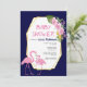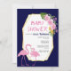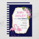 Goldfolie Polygon, Flamingos und tropische Blume marineblaue Mädchen Dusche Einladung. Es verfügt über rosa Flamingos, tropische Blume und Blätter. Der Text ist in einem weißen Rahmen mit goldfarbenem Polygonrahmen auf marinblauem Hintergrund. Auf der Rückseite ist ein Streifen mit marineblau-weißen Streifen.