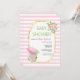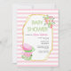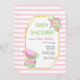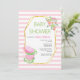 Goldfolie Polygon, Teetassen und Blume Tee-Party Mädchen Dusche Einladung. Es verfügt über rosa und grüne Teetassen, Blume und Blätter. Der Text ist in einem weißen Rahmen mit goldenem Polygonrahmen. Dahinter befindet sich ein gestreiftes Muster mit rosa und weißen Streifen.