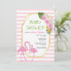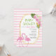 Goldfolie Polygon, Flamingos und tropische Blume Mädchen Dusche Einladung. Es verfügt über rosa Flamingos, tropische Blume und Blätter. Der Text ist in einem weißen Rahmen mit goldenem Polygonrahmen. Dahinter befindet sich ein gestreiftes Muster mit rosa und weißen Streifen.