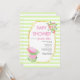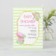Goldfolie Polygon, Teetassen und Blume Tee-Party Mädchen Dusche Einladung. Es verfügt über rosa und grüne Teetassen, Blume und Blätter. Der Text ist in einem weißen Rahmen mit goldenem Polygonrahmen. Dahinter befindet sich ein Streifen mit blassgrünen und weißen Streifen.