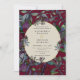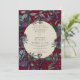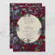 Diese burgundische Hochzeitseinladung enthält lila und rote Blume, Grünpflanzen und goldene gerahmte Oval- und Goldschrift. Passen Sie Ihre Hochzeitsdetails an.