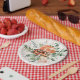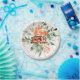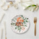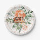 Eine schöne Papiertafel aus Brautparty mit einem goldenen Ehering-Muster-Overlay mit einer riesigen Aquarellorange-Rose in der Mitte der Platte.