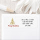 Einfach und elegant beschreibt diesen Rücksendeadresseaufkleber. Ein zeitgenössisches Gold verzeichnete Weihnachtsbaum in einer Liste. mit frohen Weihnachten zentrierte darunterliegend, in einer roten Skriptart Schriftart. Fertigen Sie mit Ihren Informationen besonders an.