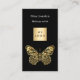 Ein schwarzer Hintergrund. Die Einrichtung ist mit einem vergoldeten Imitat-Schmetterling auf der Vorderseite geschmückt. Personalisieren Sie Ihr Firmenlogo, Ihren Namen, Ihren Titel und Ihre Kontaktinformationen. Fügen Sie Ihre Website url/link zum Qr-Code hinzu. Mit Facebook und Instagram Icons. Weißer Text.