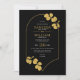Diese schöne Hochzeitseinladung wird mit einem exquisiten Design, das von Goldschmuck inspiriert ist, mit einer Kombination aus Rahmen- und Blattmotiven geschmückt. Es hat ein zeitgenössisches Ambiente und zeigt anmutig Ihre personalisierte Botschaft in einem goldenen Rahmen, der oben aufragt und ganz unten an einen Punkt kommt, mit Ästen und Blattwerk auf einem schwarzen Hintergrund. Um das zu einem einladen zu können, werden die Namen der Paare in einem diagonalen, schwarz-goldfarbenen Layout auf der Rückseite dargestellt.