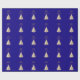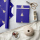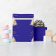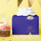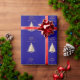 Ein blauer Hintergrund. Mit einem schneebedeckten Baum dekoriert. Fröhliche Weihnachten wird mit einem eleganten, handgeschriebenen Stil geschrieben. Personalisieren Sie Ihren Familiennamen und fügen Sie ihn hinzu. Goldener Text.