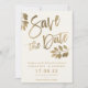 Goldskriptblatt Save the Date Einladung Hochzeit Sammlung. Schicken Sie Ihre Save the Date-Karte mit diesem eleganten Imitat mit goldener Typografie mit Blattblättern, ideal für eine elegante Hochzeit im eleganten Stil