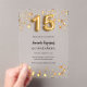 Für eine elegante Quinceañera, 15. Ein klarer, transparenter Hintergrund. Goldene Sterne, und die Zahl 15 in Imitat Gold. Personalisieren Sie Ihren Namen und Ihre Party-Daten und fügen Sie diese hinzu.