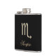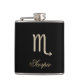 Goldtierkreis-Zeichen-Skorpion auf schwarzer Flasche. Eine handliche Taschenflasche mit einem Goldastrologischen Symbol für Tierkreiszeichen Skorpion der Skorpion mit Goldordnung und der Wort Skorpion geschrieben in metallisches Goldskript. Behalten Sie Ihren Lieblingsskorpion glücklich und helfen Sie ihnen zu feiern!